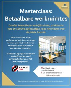 De workshop “Betaalbare Werkruimtes voor Ondernemers,” georganiseerd in samenwerking met Zuidoost City, biedt ondernemers de kans om meer te leren over het vinden van betaalbare werkruimtes in Amsterdam Zuidoost. Zuidoost City legt hun nieuwe werkwijze uit en geeft praktische tips voor het aanvraagproces. Ondernemers leren hoe ze zich optimaal kunnen voorbereiden, inclusief het opstellen van een sterk businessplan. Ook worden er handvatten geboden om de kans op een betaalbare ruimte te vergroten, met aandacht voor timing, netwerken en flexibiliteit. Deze interactieve sessie biedt waardevolle inzichten en directe begeleiding voor ondernemers.