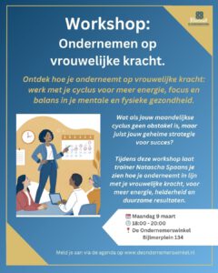 Ondernemen is topsport, daarom is het belangrijk als ondernemer dat je goed voor je mentale en fysieke gezondheid zorgt. Doordat het vrouwelijke lichaam cyclisch is, ziet zelfzorg er iedere week van de maand net een beetje anders uit. In deze workshop leer je hoe je lichaam beïnvloed wordt door de hormonen, wat je lichaam op verschillende momenten nodig heeft én wat je kwaliteiten en valkuilen zijn in iedere fase van je cyclus, zodat je deze slim kunt inzettten in het ondernemerschap.